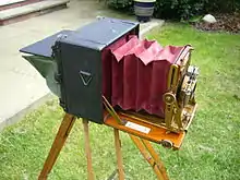 This type of camera was first developed in the era of the daguerreotype[2] (1840s-1850s) and is still in use today, some with various drive mechanisms for movements (rather than loosen-move-tighten), more scale markings, and/or more spirit levels. It comprises a flexible bellows that forms a light-tight seal between two adjustable standards, one of which holds a lens, and the other a ground glass or a photographic film holder or a digital back.[3] There are three general types, the rail camera, the field camera, and others that don't fit into either category.