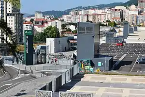 Vigo railway station, also known as Vigo-Urzáiz, is a railway terminus in Vigo, Spain. It provides high speed train connection through the Atlantic Axis high-speed rail line with main Galician cities as Pontevedra, Vilagarcía de Arousa, Santiago de Compostela and A Coruña every hour. The station is directly connected through the bus stop in Urzaiz street (50 m from the station hall) with the Airport (line 9A) and the Bus Station (line 4C). There is a taxi stop in front of the station.