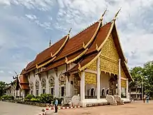 As Buddhism spread in Southeast Asia, monasteries were built by local kings. The term vihara is still sometimes used to refer to the monasteries/temples, also known as wat, but in Thailand it also took on a narrower meaning referring to certain buildings in the temple complex. The wihan is a building, apart from the main ubosot (ordination hall) in which a Buddha image is enshrined.[37] In many temples, the wihan serves as a sermon hall or an assembly hall where ceremonies, such as the kathina, are held.[38][39] Many of these Theravada viharas feature a Buddha image that is considered sacred after it is formally consecrated by the monks.[38]