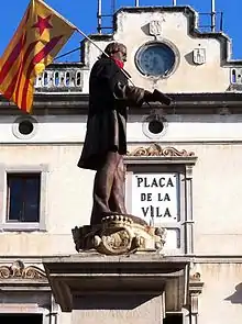 The town has a long history, and experienced an efflorescence during the Romantic period evidenced by a wealth of opulent 19th century buildings. The atmospheric town square, the Plaça de la Vila,[4] and many of its iconic public buildings were principally financed by Josep Tomàs Ventosa Soler (1797-1874) a textile magnate who made his fortune in Cuba. A monument featuring a bronze statue of Ventosa stands in the center of the square. An identical monument stands in Matanzas, Cuba, where both statues were forged.[5] Today, children play around the monument and agile climbers from castellers to protestors to carnival pranksters climb the statue and adorn it with their own symbols (see photo).