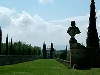 Behind the villa an avenue (allée) of Italian cypress (Cupressus sempervirens) defines the axis through gardens and fields to the base of the hill. A significant and very long stone stairway carries the axis up through the hillside's woodlands, to the focal point of the hermitage tower.