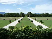 Andrea Palladio emphasises the usefulness of the lay-out in his treatise. He points out that the grain stores and work areas could be reached under cover, which was particularly important. Also, it was necessary for the Villa Emo's size to correspond to the returns obtained by good management. These returns must in fact have been considerable, for the side-wings of the building are unusually long, a visible symbol of prosperity. The Emo family introduced the cultivation of maize on their estate (and the plant, still new in Europe, is depicted in one of Zelotti's frescoes). In contrast to the traditional cultivation of millet, considerably higher returns could be obtained from the maize.[5] It is not clear if the long walk, made of large square paving-stones, which leads to the front of the house, served a practical purpose. It seems to be a fifteenth-century threshing floor.[6] However, Palladio advised that threshing should not be carried out near a house.