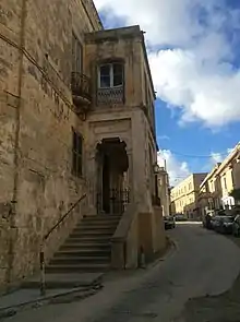 The villa is found just outside the outskirts[34] and suburb[35] of Valletta in the hamlet of Guardamangia[36] set just at the crest[37] in a quiet residential area[38] in a narrow street.[39] The villa is described as built in the form of a palace complemented with sea views over Marsamxett Harbour.[40] The Queen describes it as a "town house".[10] It is a typical traditional Maltese residence.[9] The building is built with limestone, known as sandstone and described by the Queen as "yellow stone",[10] and designed with spacious interiors.[41] The house has two entrances with one set at street level and another set after going up a flight of stairs under an elaborate front porch.[10] The royal family had taken their own personal belongings from Britain when they lived at the villa[42] allowing them to live in a lavish residence,[43] in a once-elegant home.[35] The royal family had British servants at the villa.[44]