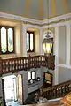 The chapel is now decorated in the Art Nouveau style with an embossed floral pattern in the ceiling decorations. In the center of the ceiling there is a special design depicting a sun interposed by a dove, a symbol of the peace that comes after the dawn. Two wooden statues in black and white, made from the wood of centuries-old park plants cut to a thickness of 3–4 centimetres (1.2–1.6 in), give a sense of grandeur. The chapel is currently used primarily for private events.