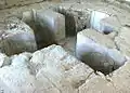 Right next to the entrance of the site are the ruins of the early Christian basilica with a cross-shaped baptistery. The building type with opposite apses is documented in Hispania five times between the 6th and the 7th century. The discovery of nine coins at the eastern end of the nave suggests a much earlier date for the Basilica of Torre de Palma, as the embossed dates are between 335 and 357. Strong remains of foundations under the basilica suggest that another sanctuary was there before believed to have been a Temple to Mars.[8]