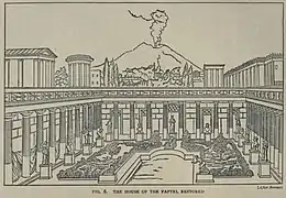 After passing through the tablinum, one arrived at the first peristyle, made up of ten columns on each side, with a swimming pool in the centre. In this area were found the bronze herm adapted from the Doryphorus of Polykleitos and the herm of an Amazon made by Apollonios son of Archias of Athens.[10] The large second peristyle could be reached by passing through a large tablinum in which, under a propylaeum, was the archaic statue of Athena Promachos. A collection of bronze busts were in the interior of the tablinum. These included the head of Scipio Africanus.[2]