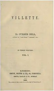 Villette was Charlotte Brontë's third and last novel published during her life. It was preceded in writing by The Professor (her posthumously published first novel, of which Villette is a reworking), Jane Eyre, and Shirley.