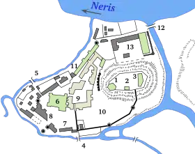 The complex consisted of three castles: the Upper, the Lower, and the Crooked (Lithuanian: Kreivoji pilis). The Crooked Castle was burned down by the Teutonic Knights in 1390 and was never rebuilt.[2] The Vilnius Castles were attacked several times by the Teutonic Order after 1390, but they did not succeed in taking the entire complex. Its complete capture occurred for the first time during the 1655 Battle of Vilnius.[3] Soon afterwards, the severely damaged castles lost their importance, and many buildings were abandoned. During the Tsarist annexation,[4][5] several historic buildings were demolished; many more were damaged during the fortress construction in the 19th century.