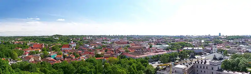 The Old Town of Vilnius (Lithuanian: Vilniaus senamiestis, Polish: Stare Miasto w Wilnie, Belarusian: Стары горад у Вільнюсе, Russian: Старый город в Вильнюсe), one of the largest surviving medieval old towns in Northern Europe, has an area of 3.59 square kilometres (887 acres). It encompasses 74 quarters, with 70 streets and lanes numbering 1487 buildings with a total floor area of 1,497,000 square meters. The oldest part of the Lithuanian capital of Vilnius, it has developed over the course of many centuries, and has been shaped by the city's history and a constantly changing cultural influence. It is a place where some of Europe's greatest architectural styles—gothic, renaissance, baroque and neoclassical—stand side by side and complement each other.
