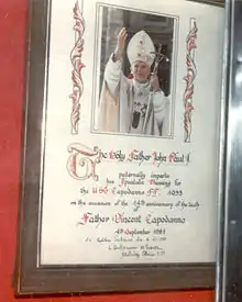 On May 19, 2002, Capodanno's Cause for Canonization was opened. In May 2004, the initial documentation was submitted to the Congregation for the Causes of Saints, with CatholicMil (later renamed Mission Capodanno) acting as Petitioner and with Capodanno's biographer Daniel Mode named Postulator. On Memorial Day weekend, May 21, 2006, Capodanno's designation as a Servant of God was announced in Washington D.C., by Archbishop Edwin F. O'Brien of the Archdiocese for the Military Services, USA. On October 1, 2013, Archbishop Timothy P. Broglio presided over the formal renewal of the opening of the Cause for Beatification. Broglio announced at this time that the newly established Capodanno Guild would serve as the Petitioner of the Cause, and Andrea Ambrosi as Roman Postulator.[10][11] Following a year-long investigation, Bishop Gerald Barbarito in 2019 officially credited Capodanno with the miraculous healing of a Florida woman with multiple sclerosis.[12]