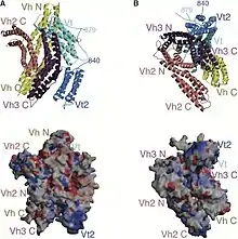 Essentially, there is an 835 amino acid N-terminal head, which is split into four domains. This is linked to the C-terminal tail with a linker region.