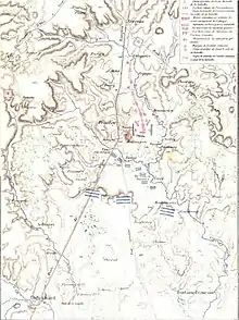 The Gallic army held a very strong position guarded by high slopes, easy to defend. It was protected by the Vingeanne on the right, and the Badin, a small tributary of the Vingeanne, on its front. In the space between these two streams and the road from Dijon to Langres was an area 5 kilometres (3.1 mi) across, slightly uneven in some parts, almost flat everywhere else, mainly between the Vingeanne and the hillock of Montsuageon. Near the road, and to the west, rise hills which dominated the ground, as well as the whole country, up to the Badin and the Vingeanne.[10]