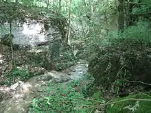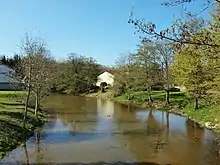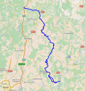 The Vinganne is a torrential watercourse.[1] The source of the Vingeanne is near the village of Aprey, Haute-Marne. It forms as a stream that has carved a narrow canyon in the edge of the Langres plateau.[2] It forms at an altitude of 429 metres (1,407 ft) and flows south for 92.9 kilometres (57.7 mi) to the Saône,[3] which it joins at an altitude of 187 metres (614 ft). Tributaries are the streams (ruisseaux) of Flagey, Leuchey, Anjeurres and Orain.[4]