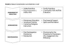 The Sabaoon Project, initiated by the Pakistan Army and run by the Social Welfare Academics and Training organization (SWAaT) since 2009, has been implemented to deradicalize and rehabilitate former militant youth who were involved in violent extremist activities and apprehended by the army in Swat and the surrounding areas in Pakistan. Based on an individualized approach and intervention, the project follows a three-step model (see image).[19]