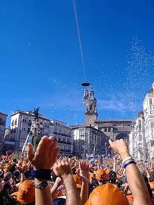 At six o'clock in the afternoon, Celedon's descent is performed from the top of the Church of San Miguel to a balcony in the square below, where Celedón (a rag doll with an umbrella) gradually goes down suspended by a wire. Meanwhile the citizens below, shower themselves in champagne and sing Celedón's song. Once he reaches the balcony the staff hide the rag doll and a human Celedón appears. Next, he has to cross the square, helped by a group of friends, to reach the Church of San Miguel and greet the crowds below and wish everyone a happy celebration. This performance marks the starting of the celebration in Vitoria-Gasteiz. At ten o'clock at night, the Virgen Blanca brotherhood is in charge of organizing a lantern procession.