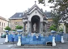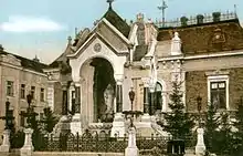 Legend goes that during György Dózsa's execution, the Jesuits, who were chanting religious songs, saw Virgin Mary's figure in the smoke, which was considered a miracle. An icon of Virgin Mary was placed there, on a pillar, in a glass-framed box, to mark the event. It was kept there while Timișoara was occupied by the Turks (for 164 years) and long after that. After the liberation of the city in 1716, the Jesuits organized processions there.[2] The icon was accidentally broken by a carter who came to the fair.[3] Bishop Joseph Lonovics raised money to replace the icon with a wood-carved one. In 1865, this icon-statue was replaced with a Bavarian stone statue.[2][3] In 1877, the Notre Dame sisters School Sisters of Notre Dame (Banat) brought at their own expense a statue from the Mayer Institute in Munich.[2] At the beginning of the 20th century, the Timișoara City Hall decided to restore the monument. It was built in 1906 according to a project by László Székely[2][3] and the statue of Virgin Mary was completed by sculptor György Kiss.[3] The monument cost between 13,571 krones (about 4 kg of gold)[3] and 23,000 krones,[2] depending on the source asked. The inauguration was on 16 December 1906. Bishop József Németh, Mayor Carol Telbisz, prime-notary Joseph Geml, architect László Székely and sculptor György Kiss participated to the ceremony.