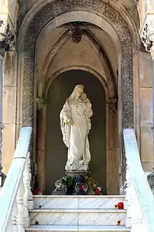 The statue is made of Carrara marble[2] and it represents the Virgin Mary holding the Christ Child. The 1.55-meter-high statue stands on a pedestal.