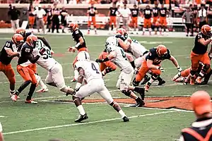 With the retirement of a UVA legend, the Virginia faithful were looking for a new coach who could bring the same success to the team that George Welsh maintained throughout his tenure. After Florida State University's Offensive Coordinator Mark Richt accepted the position as head coach of the University of Georgia, initial speculation centered on former Penn State University Defensive Coordinator Jerry Sandusky, with only Sandusky and Richt being interviewed before, on December 30, 2000, Virginia hired New York Jets head coach and former Virginia player Al Groh.[29] His first year was a rebuilding year with the team going 5–7. Groh then led the Cavaliers to four consecutive winning seasons from 2002 to 2005, including a 3–1 record in bowl games. The 2002 squad saw the breakout season of quarterback Matt Schaub, who led the Cavaliers to a 9–5 season capped by a 48–22 blowout of No. 12West Virginia in the Continental Tire Bowl. The 2003 team faced adversity with an early season injury to Schaub, but the team rallied to finish the year 8–5, including a victory over Pittsburgh in the 2003 Continental Tire Bowl. The 2004 team reached No. 6 in national polls after a 5–0 start, the Cavaliers' highest ranking since 1990, but they lost 36–3 at No. 7 Florida State and finished 8–4 after an upset loss to Fresno State in the MPC Computers Bowl. The 2005 team finished with a 7–5 record, but included Virginia's second-ever victory over Florida State and a win over Minnesota in the Music City Bowl. The 2006 squad's record slipped to 5–7. In 2007, the team went 9–3 for the season, including a 48–0 shutout of the University of Miami in the Hurricanes' last home game in the Orange Bowl Stadium, as well as setting an NCAA record for wins by two points or fewer (five).[30] Gaining an invitation to Jacksonville, Florida, for the Gator Bowl, they subsequently lost 28–31 to Texas Tech. For 2008, the team started with several big losses, but went on to win four games in a row before losing the last four of the season, finishing 5–7. Virginia's 2009 campaign under Groh started with a stunning 26–14 loss to William & Mary of the FCS (formerly I-AA). It was UVA's first loss to a I-AA team since losing to William & Mary 41–37 in 1986. The 2009 team ended 3–9 and Groh was fired following the last game of the season, a loss against rival Virginia Tech.[31]