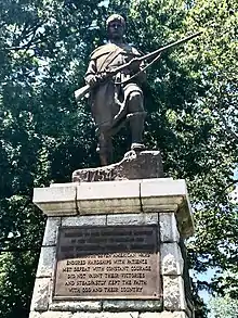 The First Virginia Regiment is memorialized in a statue in Meadow Park, a triangular park in Richmond’s (VA) Fan District by sculptor Ferruccio Legnaioli. Dedicated on 1 May 1930, to commemorate the regiment for fighting in seven American Wars, including the Civil War when they served in the Confederate Army. The statue is a seven foot high bronze standing figure of a colonial infantryman that lists the founding date of the Regiment (1754) at its base. The figure is mounted on a pedestal eight feet high which is lined with bronze plaques describing the history and service of the Regiment through seven wars.[9]