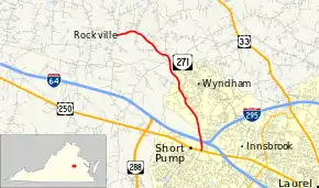 SR 271 begins at an intersection with US 250 (Broad Street) in the suburban community of Short Pump in western Henrico County. The road continues south as Pump Road. The state highway heads north as a four-lane divided highway to the east of Short Pump Town Center and crosses over Interstate 64 (I-64) just west of its western interchange with I-295. SR 271 reduces to a two-lane undivided road north of the overpass and passes along the western edge of the suburban community of Wyndham. The road temporarily becomes a four-lane divided highway again by turning left at its perpendicular intersection with Nuckols Road. SR 271 leaves the suburban area as a two-lane road that cuts through the northeastern corner of Goochland County near the headwaters of the Chickahominy River to the east before entering Hanover County. The state highway continues west to its northern terminus at the intersection of SR 620 and SR 622 in the village of Rockville. SR 622 heads south as Rockville Road and north as Walnut Hill Drive; SR 620 heads west as Dogwood Trail Road.[1][2]