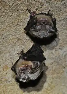 White-nose syndrome is one of the worst wildlife diseases in recent history that is currently decimating North American cave-hibernating bat populations.[25] This epidemic is responsible for mass mortalities in hibernating North American bats, and is caused by a uniquely cold-adapted fungus Pseudogymnoascus destructans. The fungus begins to grow on bats during the winter hibernation season, when bats are in torpor and immune-compromised. The body temperature of a hibernating bat is the optimal fungal growth environment.[25] The fungus has affected 90% of species that hibernate in caves for the winter. Pseudogymnoascus destructans spores have been found growing on the Virginia big-eared bat. To date, no WNS mortality in this species has been observed although the syndrome has killed millions of its fellow cave-dwelling species.[26] It is currently thought that the Big Ears may have a natural immunity to WNS through a yeast that the bat 'combs' over their body that inhibits the growth of the WNS fungus.[27]