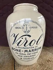 The original ingredients of Virol were red marrow extracted by the use of glycerol from the rib bones of cattle and the bones of calves, refined beef fat, diastasic malt (containing a mixture of amylases that convert starch into maltose and dextrin), eggs, lemon syrup and soluble phosphates. This emulsified product was rich in nutrients and the manufacturing process did not destroy the vitamin content.[3] Later the ingredients were slightly modified to include orange juice rather than lemon juice. Children growing up in the 1940s remember the weekly visit of the Virol Lady to their primary school, doling out spoonfuls of the sweet, sticky brown product to each child who had brought a penny to school for the purpose.[1]