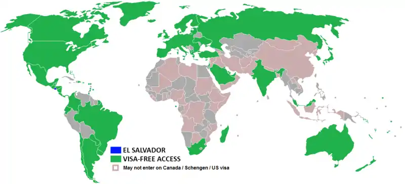 Holders of passports of the following 86 jurisdictions can visit El Salvador without a visa for up to 90 days (all visitors except the nationals of Belize, Costa Rica, Guatemala, Honduras, Nicaragua and Panama must hold proof of sufficient funds to cover their stay and documents required for next destination):[1][2]