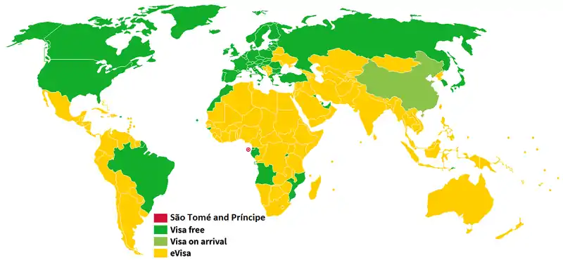 Citizens of the following 55 countries can visit São Tomé and Príncipe without a visa for up to 15 days:[1]