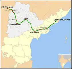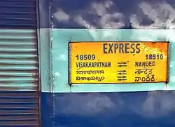 The Nanded–Visakhapatnam Express (previously Nizamabad–Visakhapatnam Express) is an Express Train service connecting the cities of Nanded, Maharashtra and Visakhapatnam in the Indian state of Andhra Pradesh.[1] It is jointly operated by the South Central Railway and South Coast Railway zones of the Indian Railways. This is a non-daily service which runs on Tuesdays, Wednesdays and Saturdays. The train number 20811 runs from Visakhapatnam to Nanded and the train 20812 runs from Nanded to Visakhapatnam on Sundays, Wednesdays and Thursdays.
