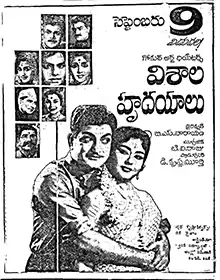 Visala Hrudayalu (transl. Broad Hearts) is a 1965 Indian Telugu-language drama film, produced by Donepudi Krishna Murthy under the Gokul Art Pictures banner and directed by B. S. Narayana. It stars N. T. Rama Rao, Krishna Kumari with music composed by T. V. Raju.[1][2] This film's name was earlier announced as Preminchi Pelli Chesuko before getting renamed.[3]