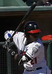 Guerrero opened the 2017 minor league season with the Class-A Lansing Lugnuts. In a 6–3 win over the Great Lakes Loons on April 7, he hit his first home run of the season.[13][14] Guerrero was named a Midwest League All-Star on June 7,[15] and on June 29, he was named to the World team roster for the 2017 All-Star Futures Game.[16] On July 6, the Blue Jays announced Guerrero would be promoted to the Advanced-A Dunedin Blue Jays following the All-Star Futures Game.[17] In a game against the Clearwater Threshers on August 31, Guerrero hit a home run to give the Blue Jays a 5–3 victory, with the win ensuring Dunedin would make the Florida State League playoffs.[18] Guerrero finished the 2017 regular season with a .323 batting average, 13 home runs, and 76 RBI in 119 games played. He also walked more than he struck out, with 76 and 62 respectively, and posted a .910 on-base plus slugging percentage (OPS).[10] On September 6, Guerrero was named ESPN's Prospect of the Year.[19][20] During the offseason, he played in 26 games for the Leones del Escogido of the Dominican Winter League.[10]