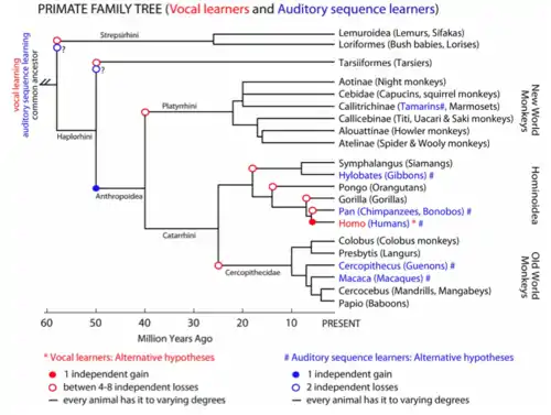 In primates, only humans are known to be capable of complex vocal learning. Similar to the first hypothesis relating to birds, one explanation is that vocal learning evolved independently in humans. An alternative hypothesis suggests evolution from a primate common ancestor capable of vocal learning, with the trait subsequently being lost at least eight other times. Considering the most parsimonious analysis, it seems unlikely that the number of independent gains (one in humans) would be exceeded so greatly by the number of independent losses (at least eight), which supports the independent evolution hypothesis.[1]