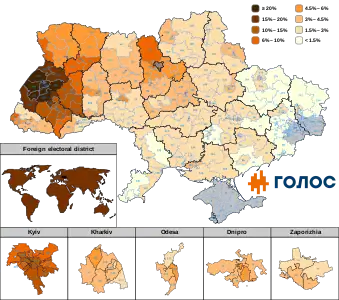 In the October 2020 Ukrainian local elections Voice had some local success, having led its factions to the Lviv Oblast Council, to the city councils of Kyiv, Lviv, Cherkasy, a number of other city councils, including even in the Donbass.[34] The parties mayoral candidate made it to the second round of the election in Cherkasy, which he lost.[34][35]