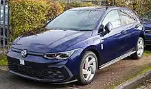 The exterior of the Mk8 has evolutionary design changes, with a new two-dimensional Volkswagen logo and more angular styling. At the rear there are new L-shaped taillights similar to those of the T-Roc. A more prominent downward arch at the nose contributes to a reduced drag coefficient; the Mk8's is Cd=0.275 compared to the Mk7's Cd=0.29, giving a drag area of 0.61 m2.[4][5] The dimensions are roughly the same as the Mk7, 29 mm longer and 10 mm narrower with a similar wheelbase. The three-door hatchback has been discontinued, leaving the five-door hatchback as the only model available at launch. The Golf Estate (Variant) was revealed in September 2020, alongside a rugged "Alltrack" version with slightly-raised suspension, body cladding, and all-wheel-drive.