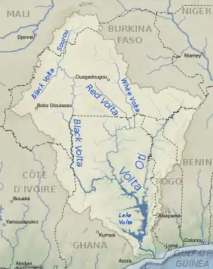 ![]() Map of the Volta River drainage basin and its main three tributaries, the White Volta, Red Volta, and Black Volta rivers | |