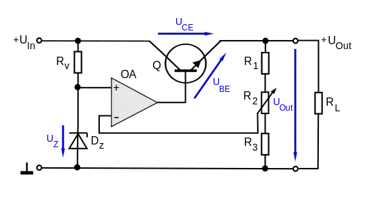 In this case, the operational amplifier drives the transistor with more current if the voltage at its inverting input drops below the output of the voltage reference at the non-inverting input. Using the voltage divider (R1, R2 and R3) allows choice of the arbitrary output voltage between Uz and Uin.