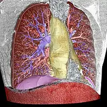 Volume rendering is distinguished from thin slice tomography presentations, and is also generally distinguished from projections of 3D models, including maximum intensity projection.[1] Still, technically, all volume renderings become projections when viewed on a 2-dimensional display, making the distinction between projections and volume renderings a bit vague. Nevertheless, the epitomes of volume rendering models feature a mix of for example coloring[2] and shading[3] in order to create realistic and/or observable representations.