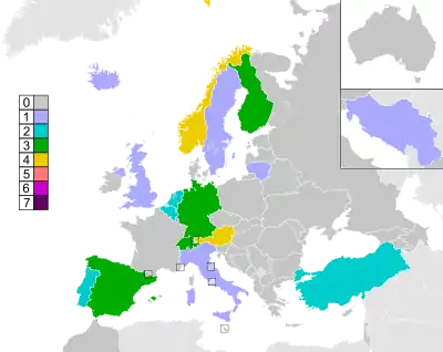 Since the creation of a qualifying round (semifinal) in 2004[27] and an expansion to two semifinals in 2008,[28] more than thirty countries vote each night – even countries which have been eliminated or have already qualified. No points are rarer; it would require a song to place less than tenth in every country in jury voting and televote.