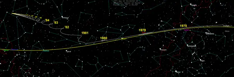 ![]() Voyager 1's trajectory seen from Earth, diverging from the ecliptic in 1981 at Saturn and now heading into the constellation Ophiuchus |