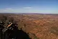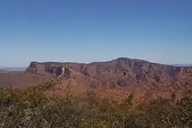 The central ranges are of a different topographical nature to the rest of the Flinders, being composed of roughly flat-lying strata, creating a high plateau into which spectacular gorges have been cut, instead of the buckled and folded strata further south which lead to the ubiquitous cuestas of Wilpena Pound. The Gammons are dominated by "The Plateau" in the southwest, which is contiguous with and of much the same height as the Blue Range further northeast, culminating in Benbonyathe Hill (1064m), the highest point in the Flinders north of Wilpena. Other summits on the largely flat range and plateau include Elephant Hill (with adjacent outliers North Tusk and South Tusk), Mount Changeweather, Four Winds Hill, and Prow Point. Of these "rounded hills" of the plateau, Warren Bonython writes that "at their edge the slope, which was gentle near the crest, progressively steepens and then changes dramatically into a precipice plunging down to a rock-strewn creek bed perhaps a thousand feet below"[2]