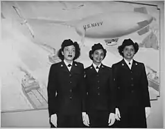 The WAVES' uniforms were designed by the New York fashion house of Mainbocher; their services were secured (without cost) through the efforts of Josephine Forrestal, a former fashion editor at Vogue and the wife of the Assistant Secretary of the Navy.[30][31] The winter uniform was made from navy blue wool, worn with a white shirt and dark blue tie. The jacket was single-breasted and unbelted, with a six-gored skirt. Included were black Oxford shoes and cap and plain black pumps, a brimmed hat, black gloves, black leather purse, and rain and winter coats. The summer uniform was similar to the winter uniform but lighter in weight, made of white material, and worn with white shoes.[32] Later, a gray-and-white-striped seersucker work uniform for summer was added, and slacks and dungarees could be worn when appropriate.[33]