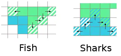 - At each chronon, a shark moves randomly to an adjacent square occupied by a fish. If there is none, the shark moves to a random adjacent unoccupied square. If there are no free squares, no movement takes place.