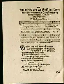 Bach composed this cantata to complete his second annual cycle of cantatas of 1724/25, a cycle planned to be of chorale cantatas.[5][7] It is based on Philipp Nicolai's Lutheran hymn in three stanzas, "Wachet auf, ruft uns die Stimme",[4] which is based on the Gospel.[5] Published in Nicolai's FrewdenSpiegel deß ewigen Lebens (Mirror of Joy of the Life Everlasting) in 1599, its text was introduced: "Ein anders von der Stimm zu Mitternacht / vnd von den klugen Jungfrauwen / die jhrem himmlischen Bräutigam begegnen / Matth. 25. / D. Philippus Nicolai." (Another [call] of the voice at midnight and of the wise maidens who meet their celestial Bridegroom / Matthew 25 / D. Philippus Nicolai).[8]
