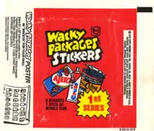 Wacky Packages are a series of humorous trading cards featuring parodies of consumer products. The cards were produced by Topps beginning in 1967, usually in a sticker format. There were 16 series produced between 1967 and 1977, with some reprints and several new series released up to the present day.