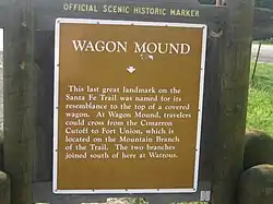 Wagon Mound is a village in Mora County, New Mexico, United States. It is named after and located at the foot of a butte called Wagon Mound, which was a landmark for covered wagon trains and traders going up and down the Santa Fe Trail and is now Wagon Mound National Historic Landmark. It was previously an isolated ranch that housed four families that served as local traders.[3] The shape of the mound is said to resemble a Conestoga wagon. As of the 2010 census, the village population was 314. It was also called Santa Clara for many years. The village, with brightly painted houses and several stores and shops, is located on the plains of northeastern New Mexico. Interstate 25, which skirts the western side of town, gives a view of the majority of the town. Wagon Mound is not growing rapidly, but it has seen new construction along I-25, with new buildings on the northeast side of town as well.