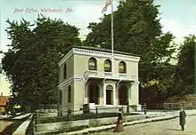 Waldoboro became county seat of Lincoln County in 1786, but the designation would shift to Wiscasset in 1880. Farms produced hay and potatoes. The Knox and Lincoln Railroad arrived and spurred the town's development. Industries would include an iron foundry, an oakum mill, a carding and cloth-dressing mill, a grain mill, sawmills and planing mills, furniture and molding mills, a door, sash and blind factory, and a carriage factory. There were also marble and granite yards and a pottery. But ship building was the principal business, with eight large vessels built in 1880.[13] During the 19th century Maine became famous for its great shipbuilding center. Waldoboro was the launching port for the Governor Ames in 1888, the first five masted schooner.[14] The Governor Ames was built in Waldoboro's Leavitt Storer Shipyard.[15] A port of entry, the town features an 1857 custom house designed by Ammi B. Young.