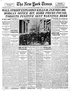 - "Havoc Wrought in Morgan Offices". The New York Times. September 17, 1920. ISSN 0362-4331. Retrieved May 6, 2020.