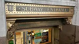 The exits for the southbound platform are on the west side of Broadway. At the southern end of the platform, two stairs are built into the facade of 71 Broadway, south of Rector Street, with one stair on either side of that building's main entrance. These staircases combine into one wide stairway that leads down to platform level.[34][2]:4–5 Another exit just north of Rector Street leads to two street stairs, which ascend to the western side of Broadway at Wall Street, outside Trinity Churchyard fence.[34][2]:6 These street stairs retain cast-iron hoods with leaf patterns, which are part of the original design; the Wall Street station is one of two stations to retain such hoods, the other being the Borough Hall station in Brooklyn.[2]:10 At the north end of the station a street exit is built into the side of the Trinity Building at 111 Broadway. It has an opulent brass-toned banner proclaiming "Subway Entrance" atop the entrance, which is half a flight below ground. The exit also has a Subway restaurant outside fare control.[35][34]