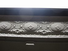 The fare control areas are at platform level. The walls along the platforms near the fare control areas consist of a pink marble wainscoting on the lowest part of the wall, with bronze air vents along the wainscoting, and white glass tiles above. The platform walls are divided at 15-foot (4.6 m) intervals by pink marble pilasters, or vertical bands. In the original portion of the station, each pilaster is topped by blue-and-green tile plaques, which contain the letter "W" surrounded by a Greek key carving. Above these "W" plaques are faience mosaics that depict a New Amsterdam step-gabled house with the palisade wall in front of it, a reference to the namesake of Wall Street. These mosaics are topped by blue faience swags and are connected by a faience cornice with scrolled and foliate detail. This decorative design is extended to the fare control areas adjacent to the original portions of the station. White-on-blue tile plaques with the words "Wall Street" and floral motifs are also placed on the walls.[2]:5–6[5]:7 The platform extensions contain similar decorative elements.[2]:5 The ceilings contain plaster molding.[2]:5[32]:10