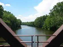 About 1 mile (1.6 km) from Huguenot Street, the trail reaches the 413-foot (126 m) Springtown bridge spanning the Wallkill River.[86] The bridge was originally made of wood and completed by the middle of December 1870,[73][87] but was rebuilt between 1880 and 1881, using iron, by Clarke, Reeves & Co.[88] It was rated by the superintendent of the Wallkill Valley Railroad to be safe for rail traffic as fast as 40 miles per hour (64 km/h).[89] The bridge's decking and benches were put in place in 1993 by volunteers and members of the nearby Hutterite community in the hamlet of Rifton.[90] The design of the bridge's railings was influenced by equestrians to better accommodate horses.[22] Immediately after the bridge is Springtown Road.[76]
